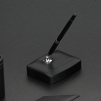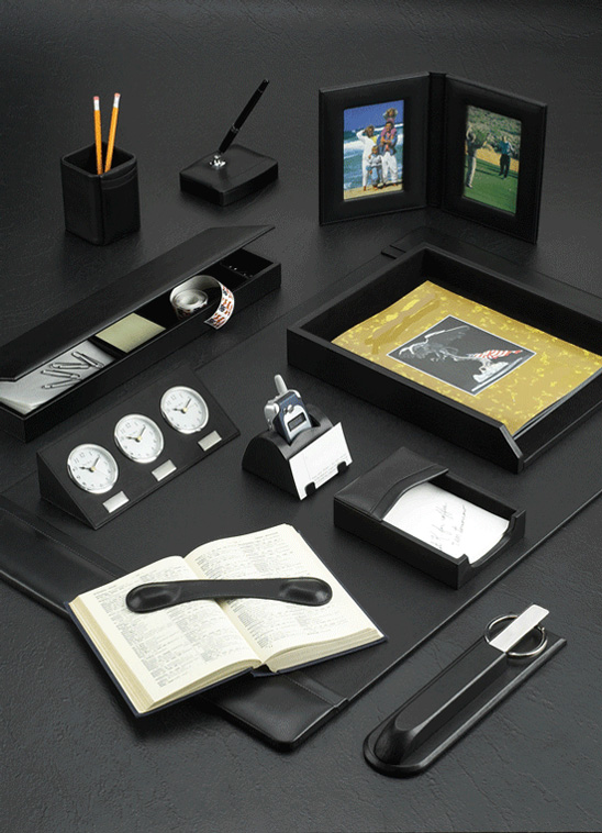 Features:- Black leather desk blotter and accessories with matching contrast stitching. Chrome plated accents. Set pieces individually sold: