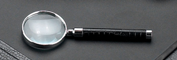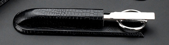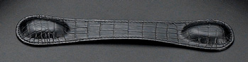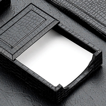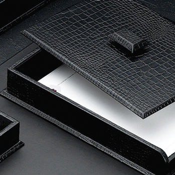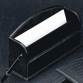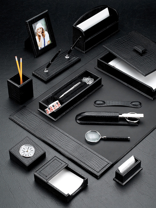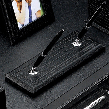 Features:- Black crocodile leather desk blotter and accessories with matching stitching. Chrome-plated brass accents. Set pieces individually sold: